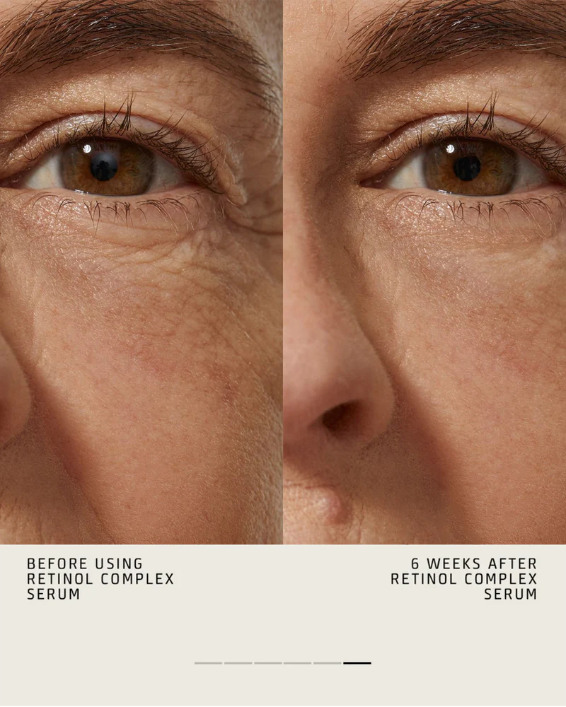 Le complexe au rétinol à 0,3 %, associé au bakuchiol, aide à stimuler la production de collagène et le renouvellement cellulaire, réduisant progressivement l’apparence des ridules et des rides plus profondes.
