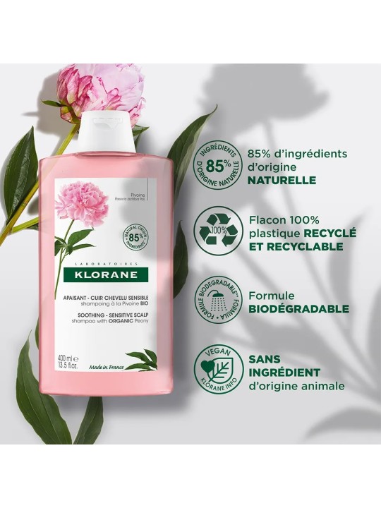 Ce Shampoing apporte dès la première utilisation et pendant 24H une sensation d’apaisement au cuir chevelu sensible, tout en respectant l’équilibre du cuir chevelu. Il tire ses propriétés apaisantes et anti-irritantes de son extrait de Pivoine de Chine BIO, une fleur cultivée dans un écosystème préservé. Avec sa formule biodégradable à 85 % d’ingrédients d’origine naturelle et au pH physiologique, le Shampoing à la Pivoine BIO apaisant lave en douceur et protège le cuir chevelu durablement. Il laisse les cheveux doux dans un parfum délicat et relaxant.