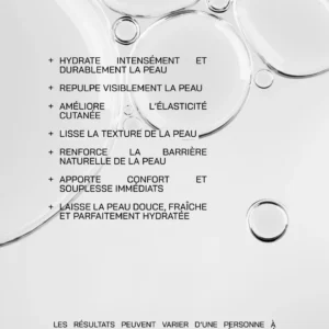 - Hydratation intense : L’acide hyaluronique à haut poids moléculaire hydrate instantanément en formant un film protecteur sur la peau.